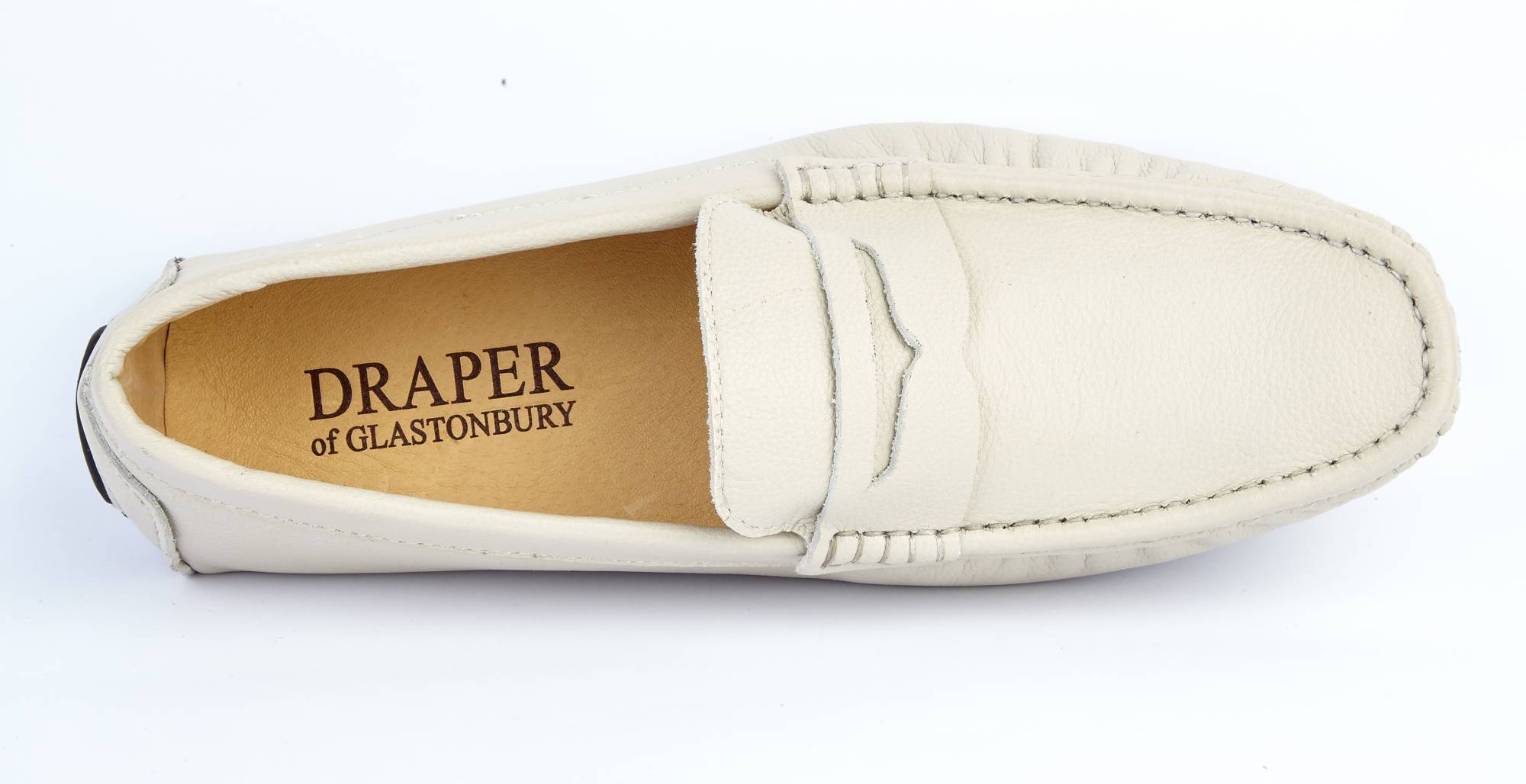 Our driving shoe for men in ecru colour leather. It has a soft leather upper, leather lining throughout, and a rubber sole which comes higher at the back to prevent wear while driving. It is a regular G width fitting, but it is wider rather than narrow.