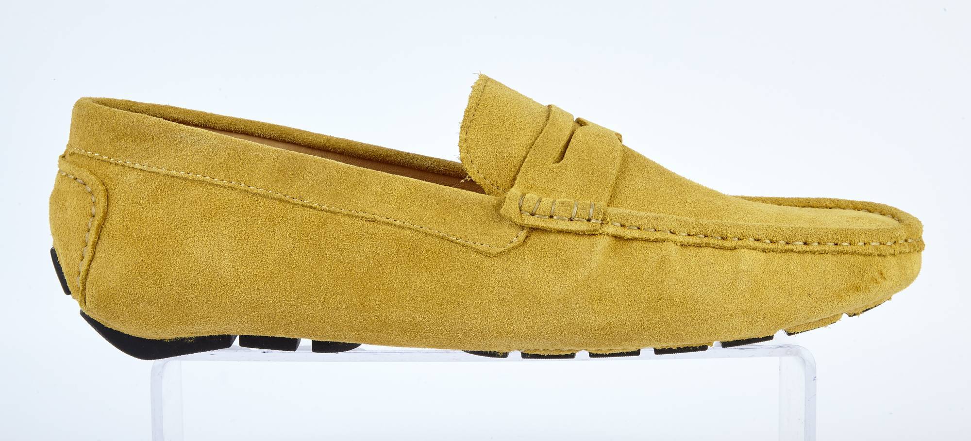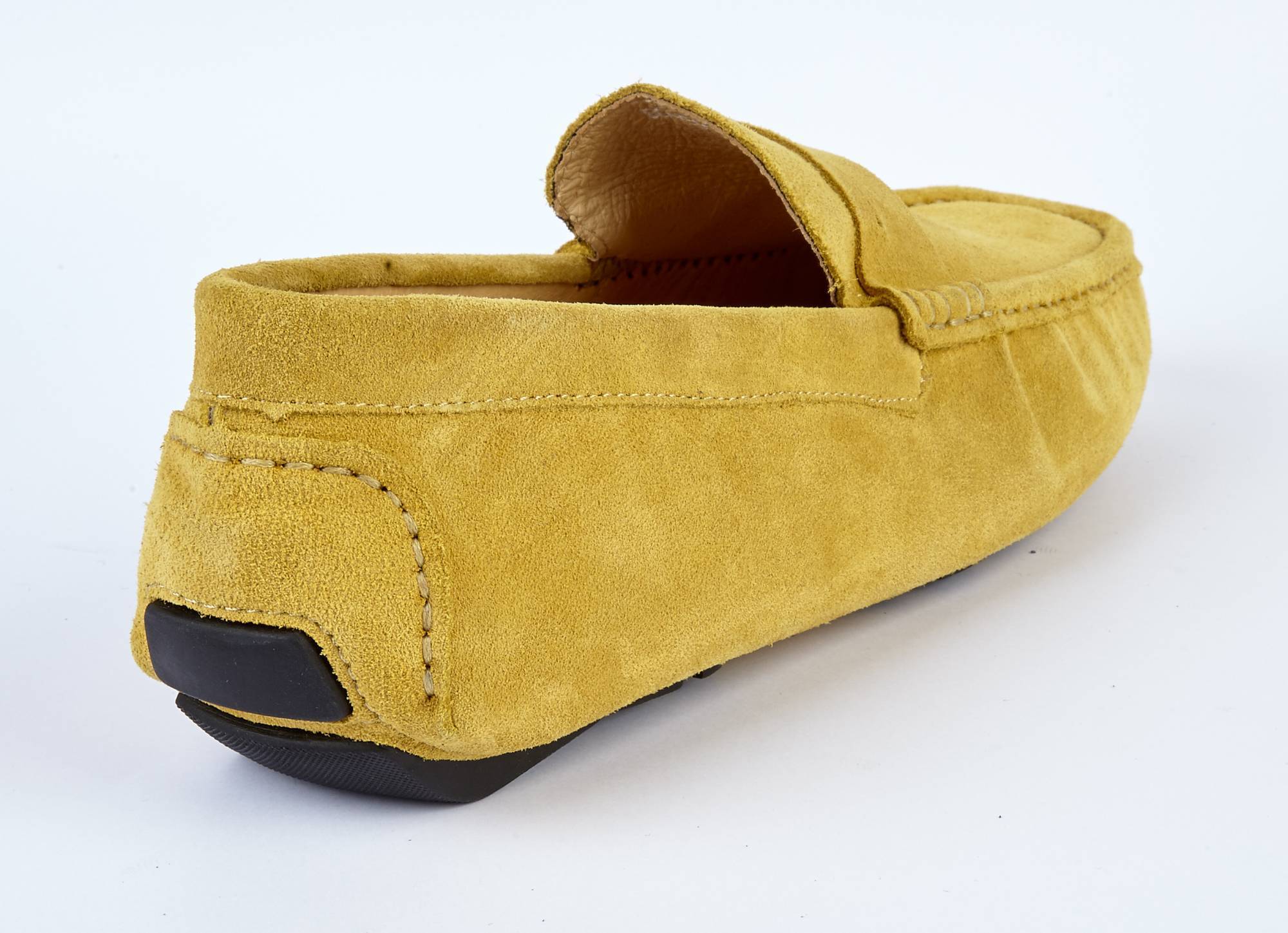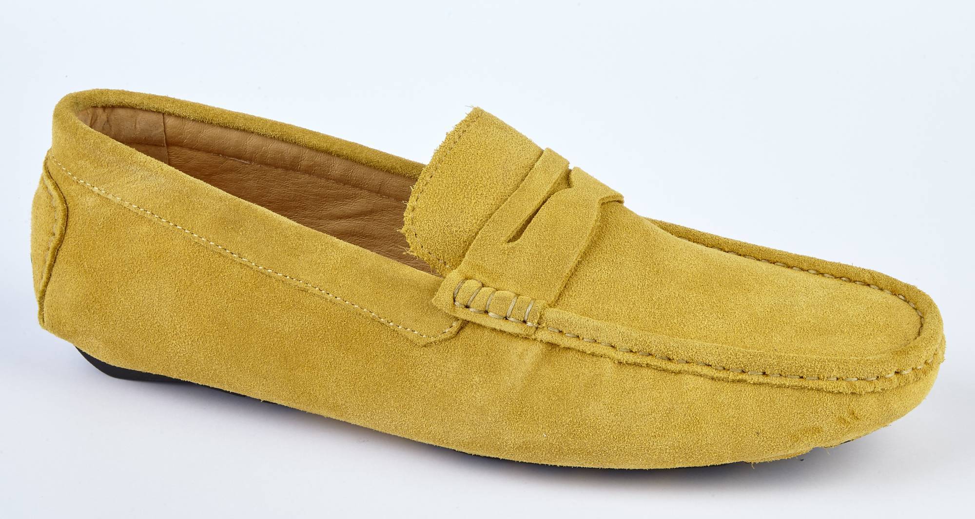 Our driving shoe for men in mustard colour suede. It has a soft suede upper, leather lining throughout, and a rubber sole which comes higher at the back to prevent wear while driving. It is a regular G width fitting, but it is wider rather than narrow.