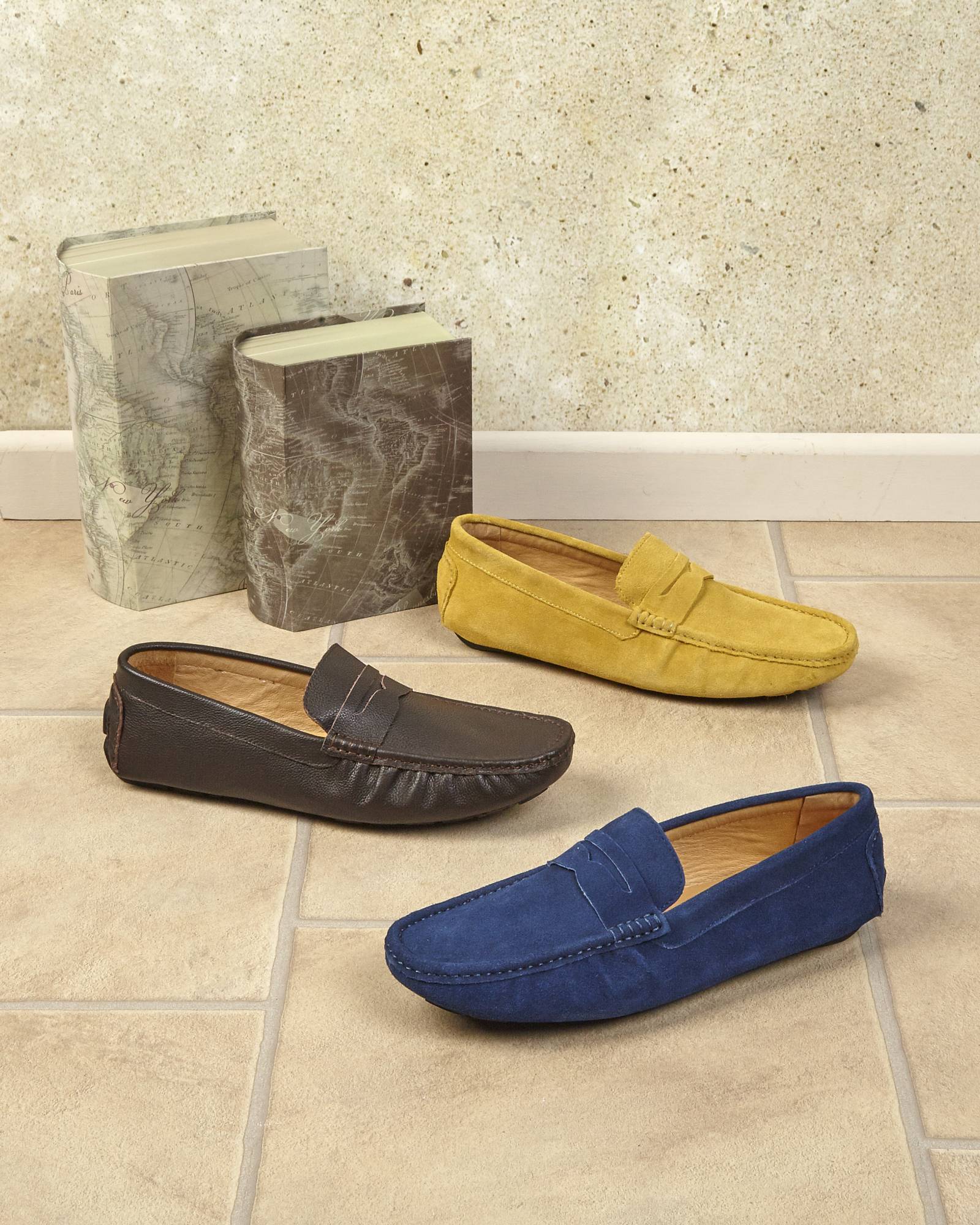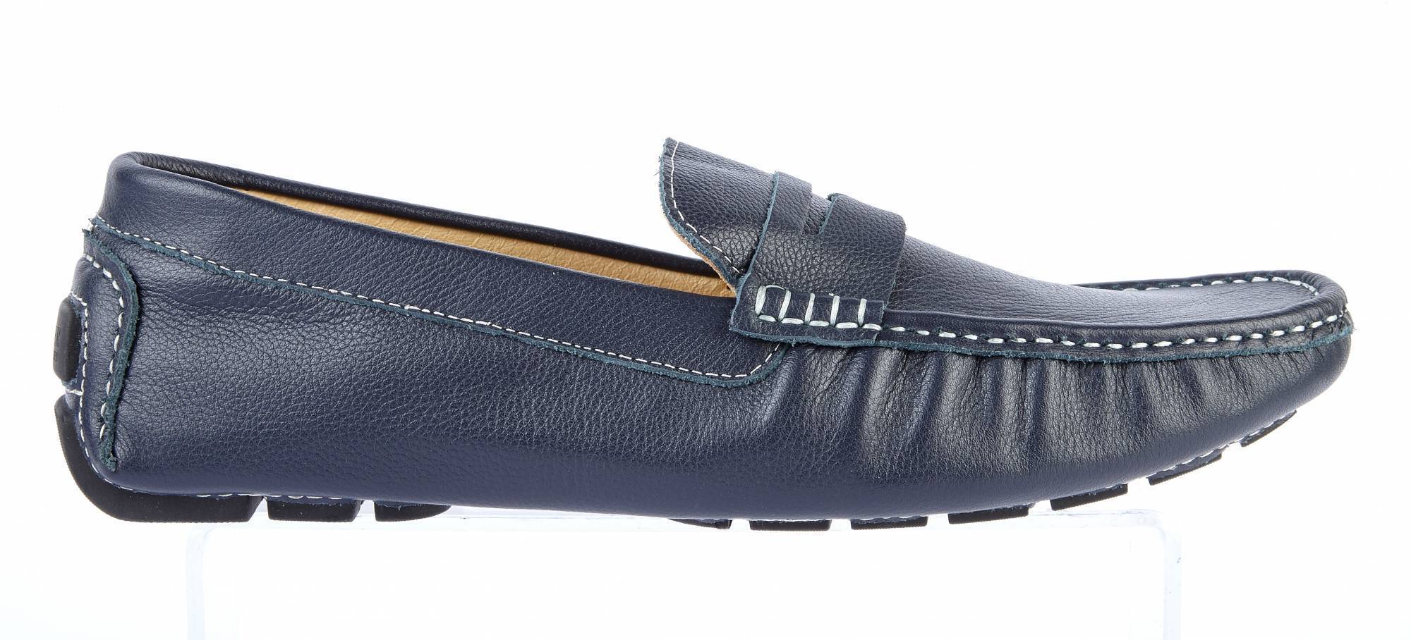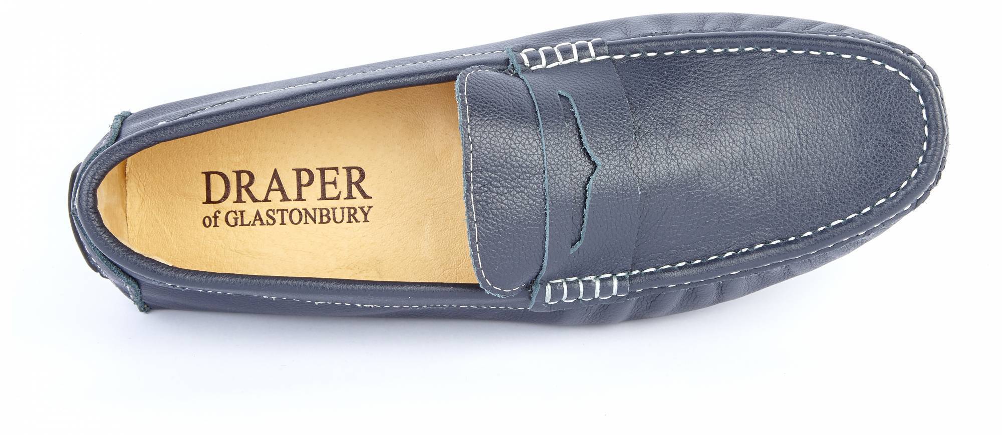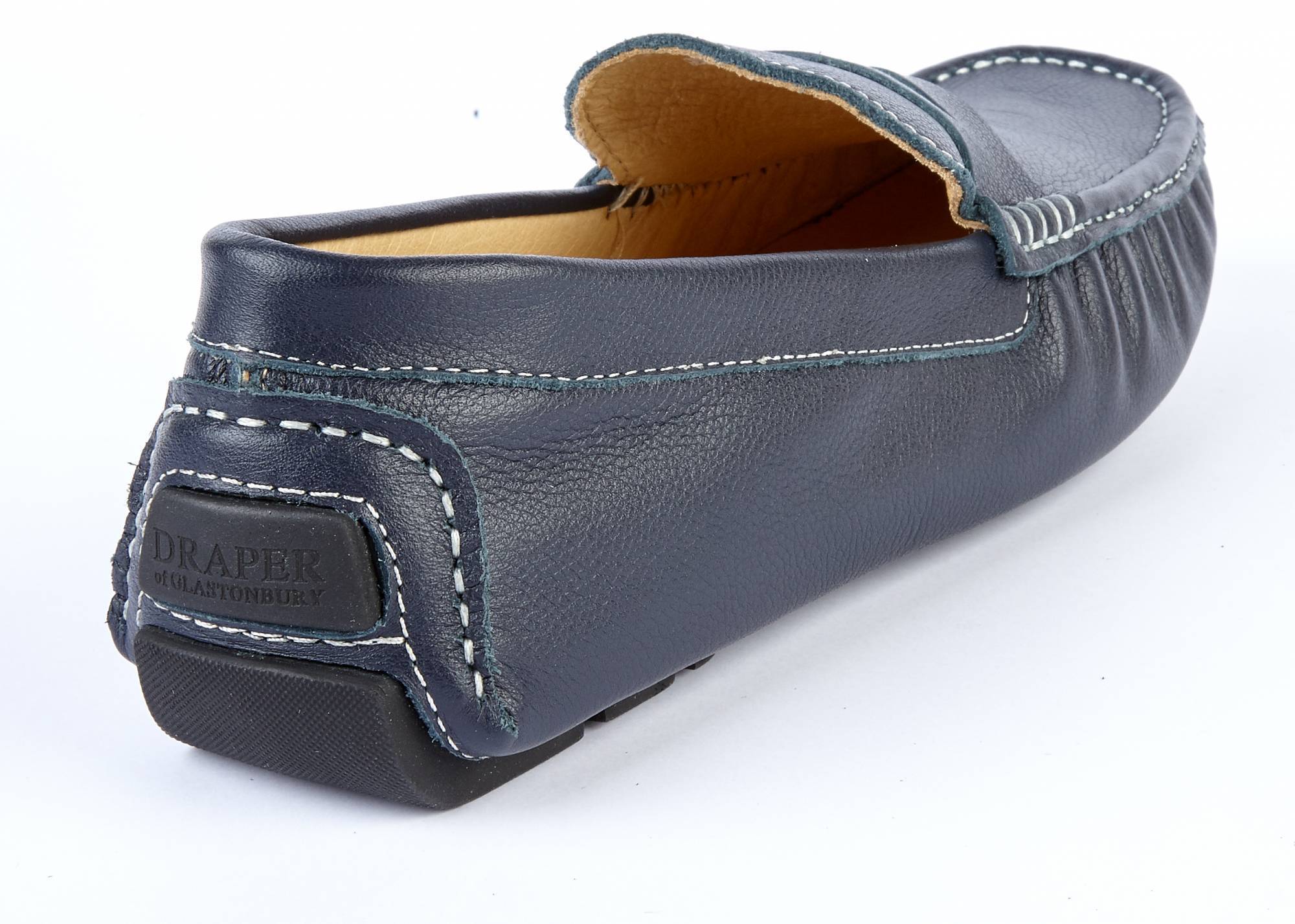 Our driving shoe for men in navy colour leather. It has a soft leather upper, leather lining throughout, and a rubber sole which comes higher at the back to prevent wear while driving. It is a regular G width fitting, but it is wider rather than narrow.