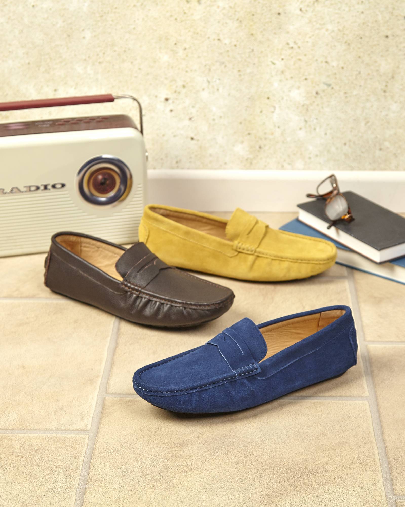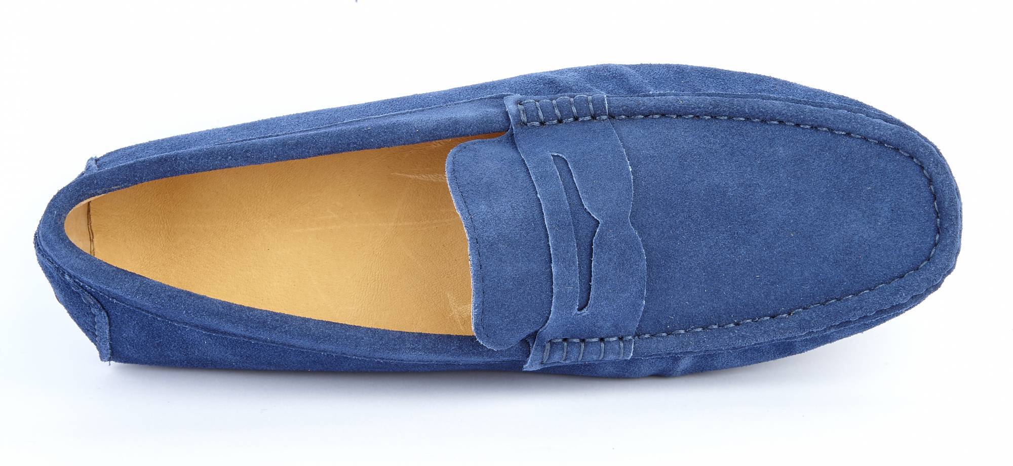 Our driving shoe for men in navy colour suede. It has a soft suede upper, leather lining throughout, and a rubber sole which comes higher at the back to prevent wear while driving. It is a regular G width fitting, but it is wider rather than narrow.
