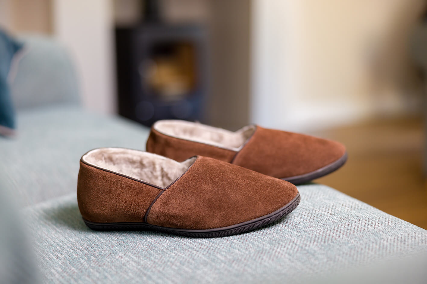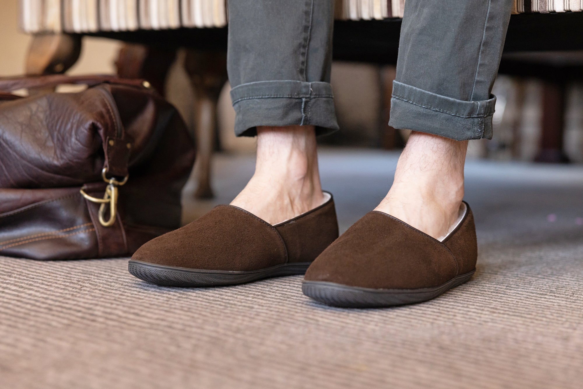 Our traditional men's slipper with our signature British shearling lining and durable rubber sole. They have a soft suede upper for ultimate comfort and traditional style, and we also offer a genuine Harris Tweed upper option too, which comes from the Isle of Harris in Scotland. Made in England.