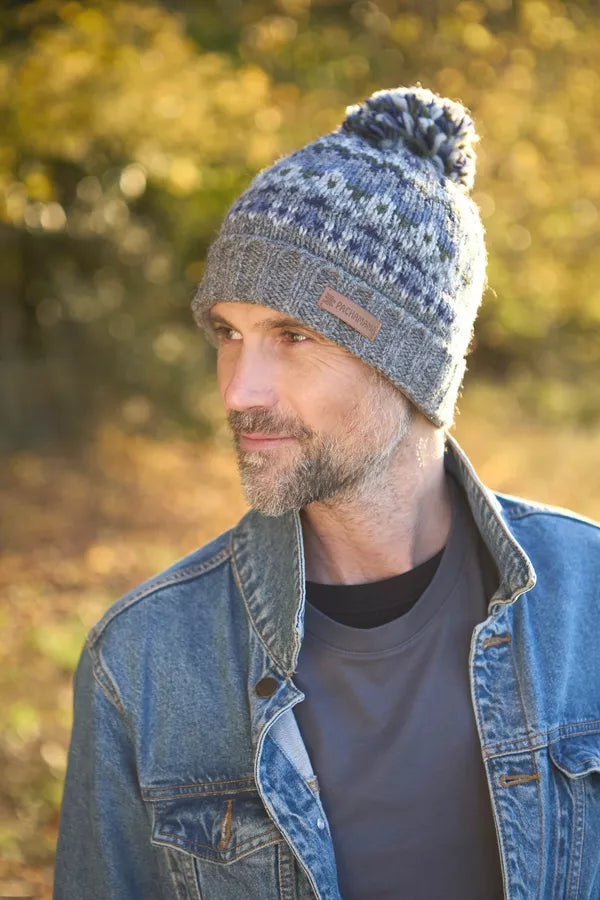 100% wool with a fleece lining. Made with a traditional fair isle pattern. Blue colour.