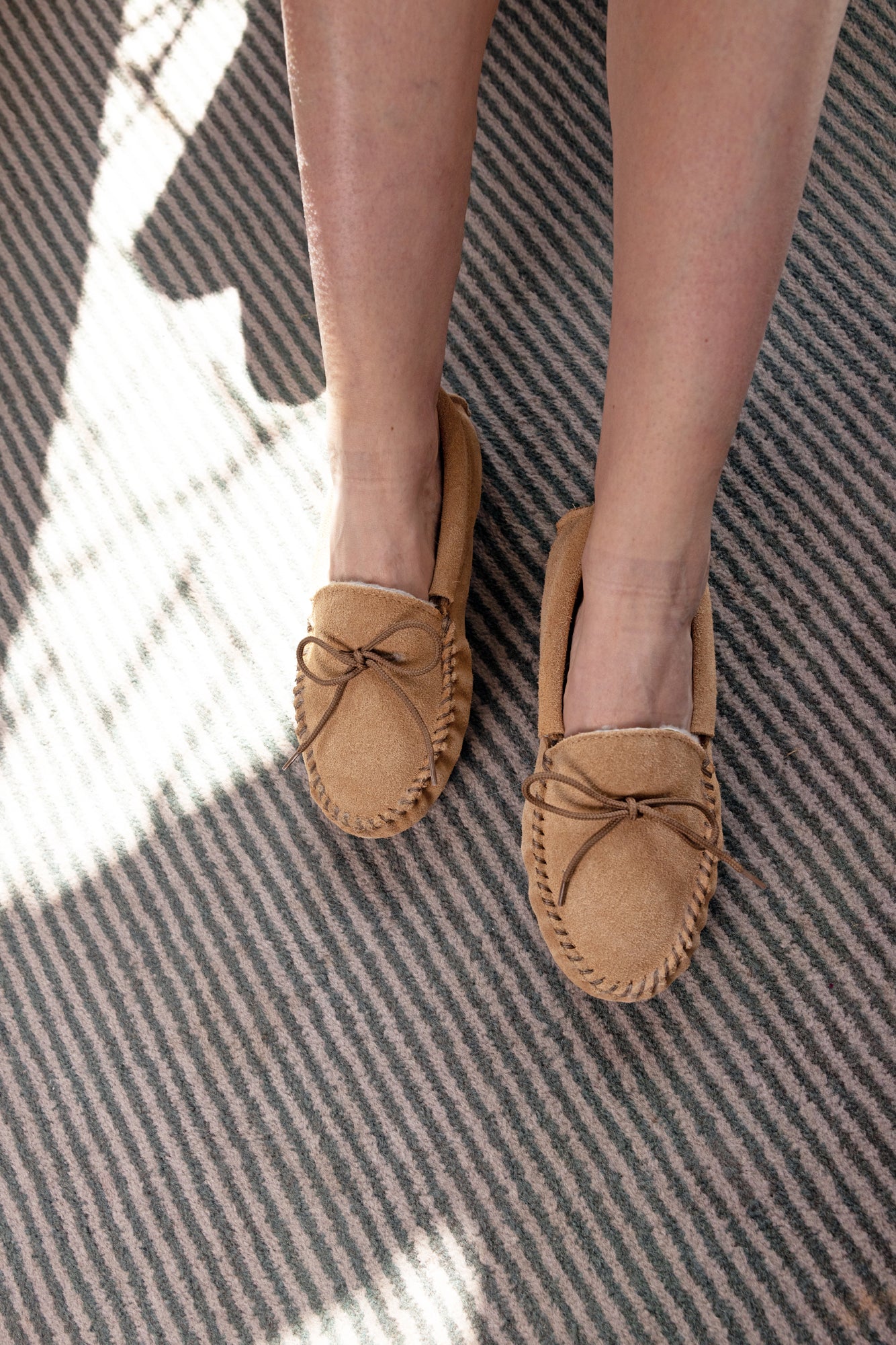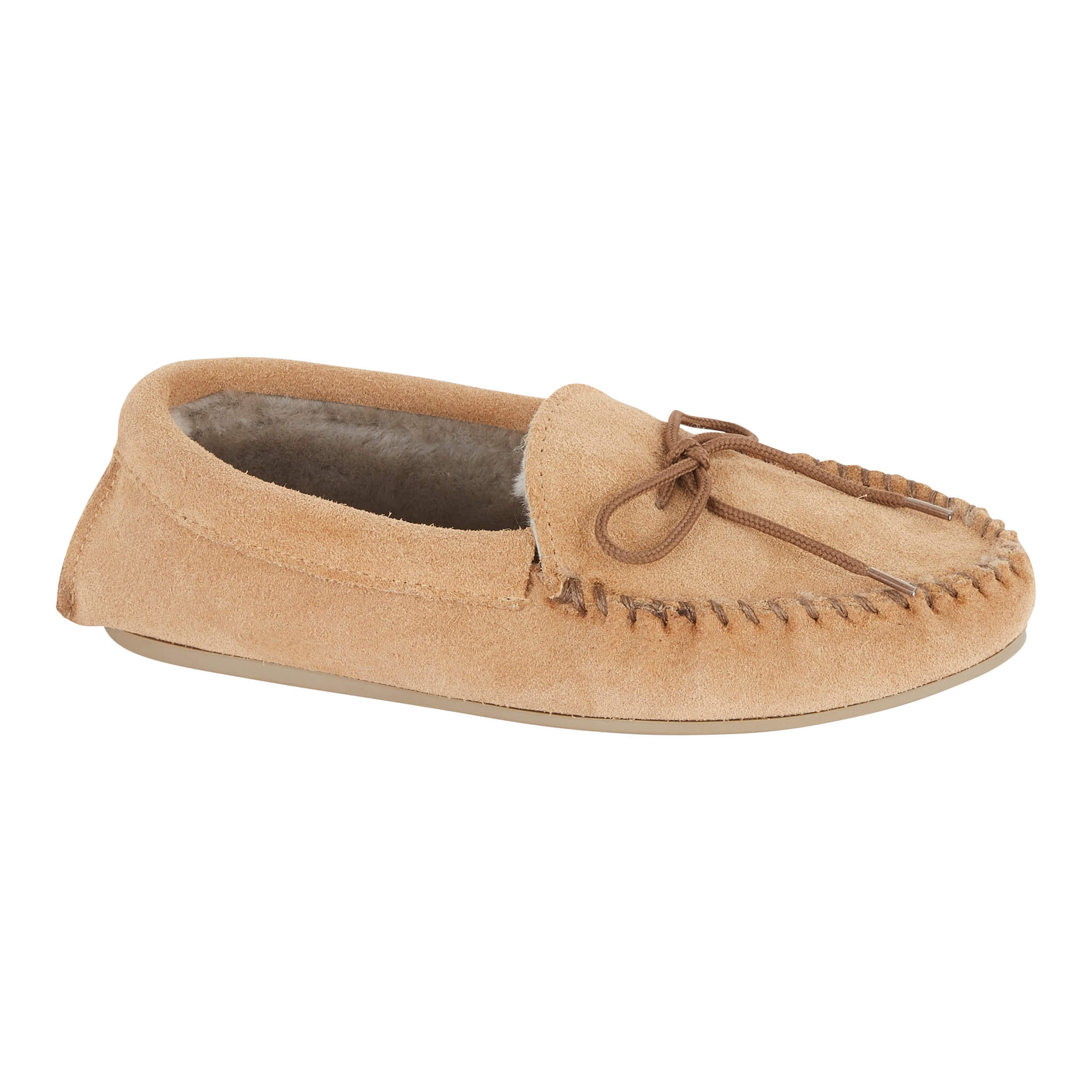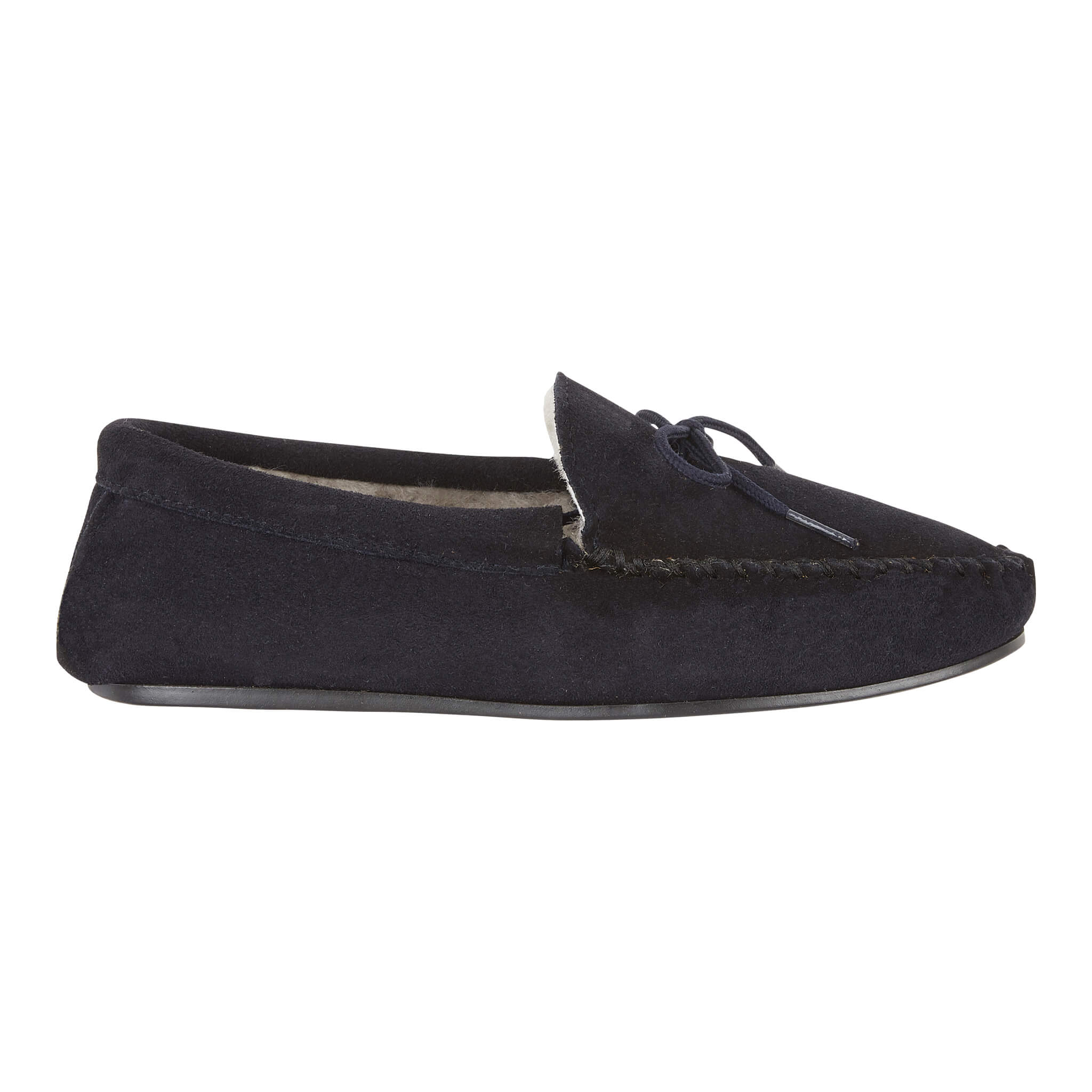 Our ladies shearling moccasin slipper. Made with a suede upper, our signature real shearling lining and a very flexible rubber sole for indoor and outdoor use. Made in England.