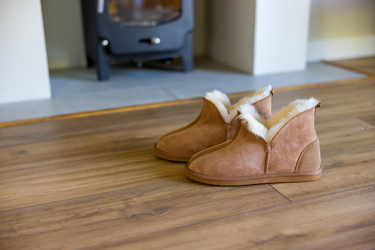 At first, it is normal for sheepskin lined slippers and boots to feel a little tight. The sheepskin will bed down and mould to the shape of your foot and feel completely normal with a short amount of wear, so this is nothing to worry about. We recommend ordering your normal shoe size. If you are a half size, then we recommend buying a size up.