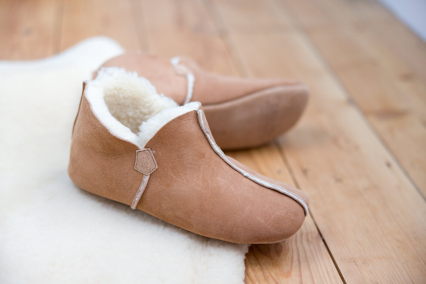 Glow is our womens pixie style shearling slipper. Made with a double faced shearling upper, our signature British shearling lining, and suede sole. Made in England.
