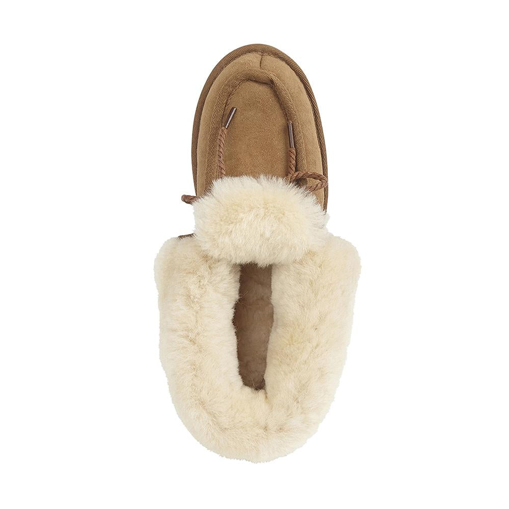 Patti is a women's shearling slipper with a collar that can turn up over the ankles. It has a double-faced shearling upper, our signature British shearling lining, and a durable rubber sole for indoor and outdoor use. It has an adjustable lace, so you can change the width fitting of the slipper.