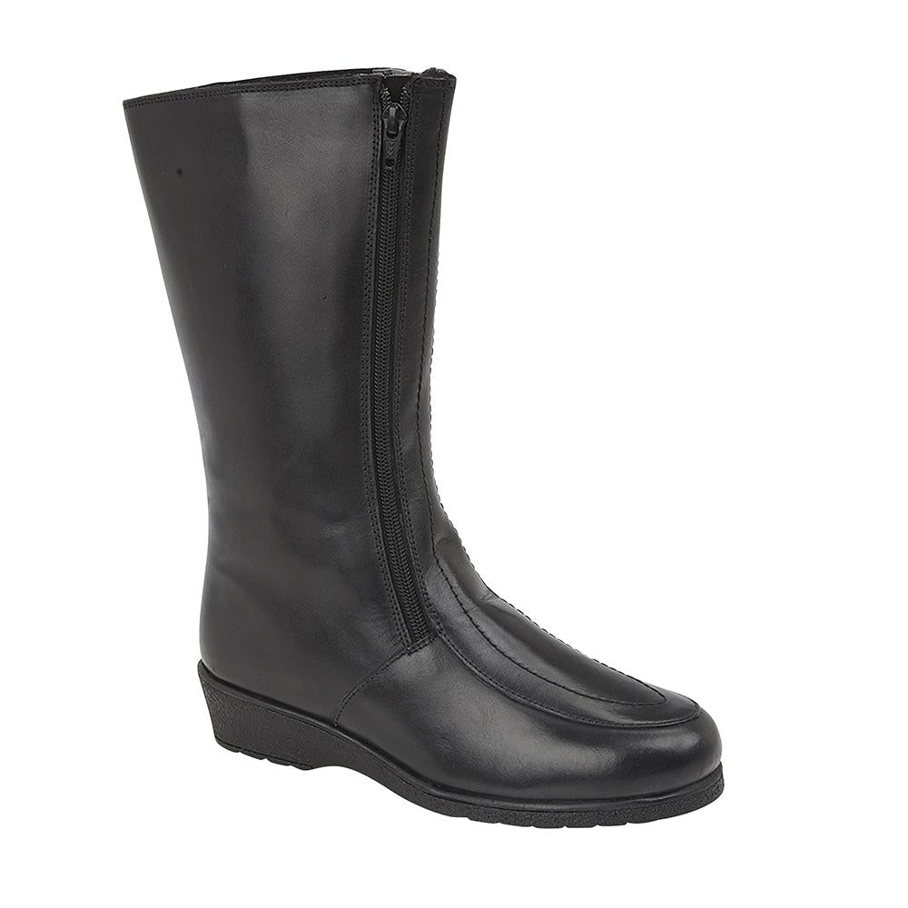 New and improved with a real shearling lining. This is our leather version of our traditional twin zip boot. It has a leather upper, two zips at the front for easy fitting, our signature shearling lining inside, and a non slip rubber sole.