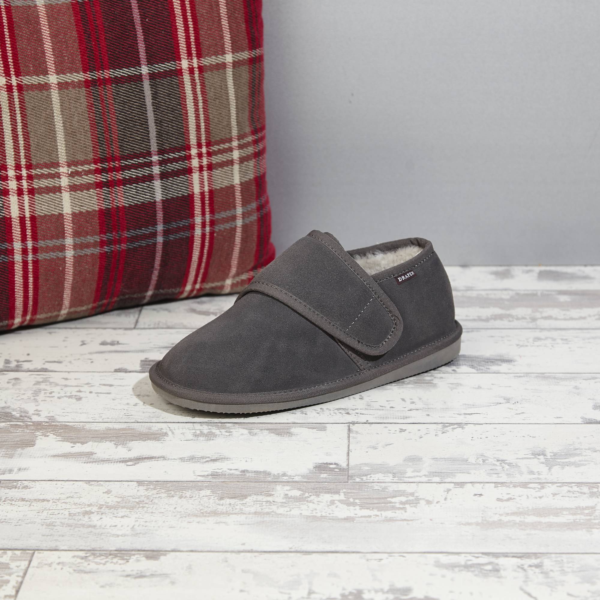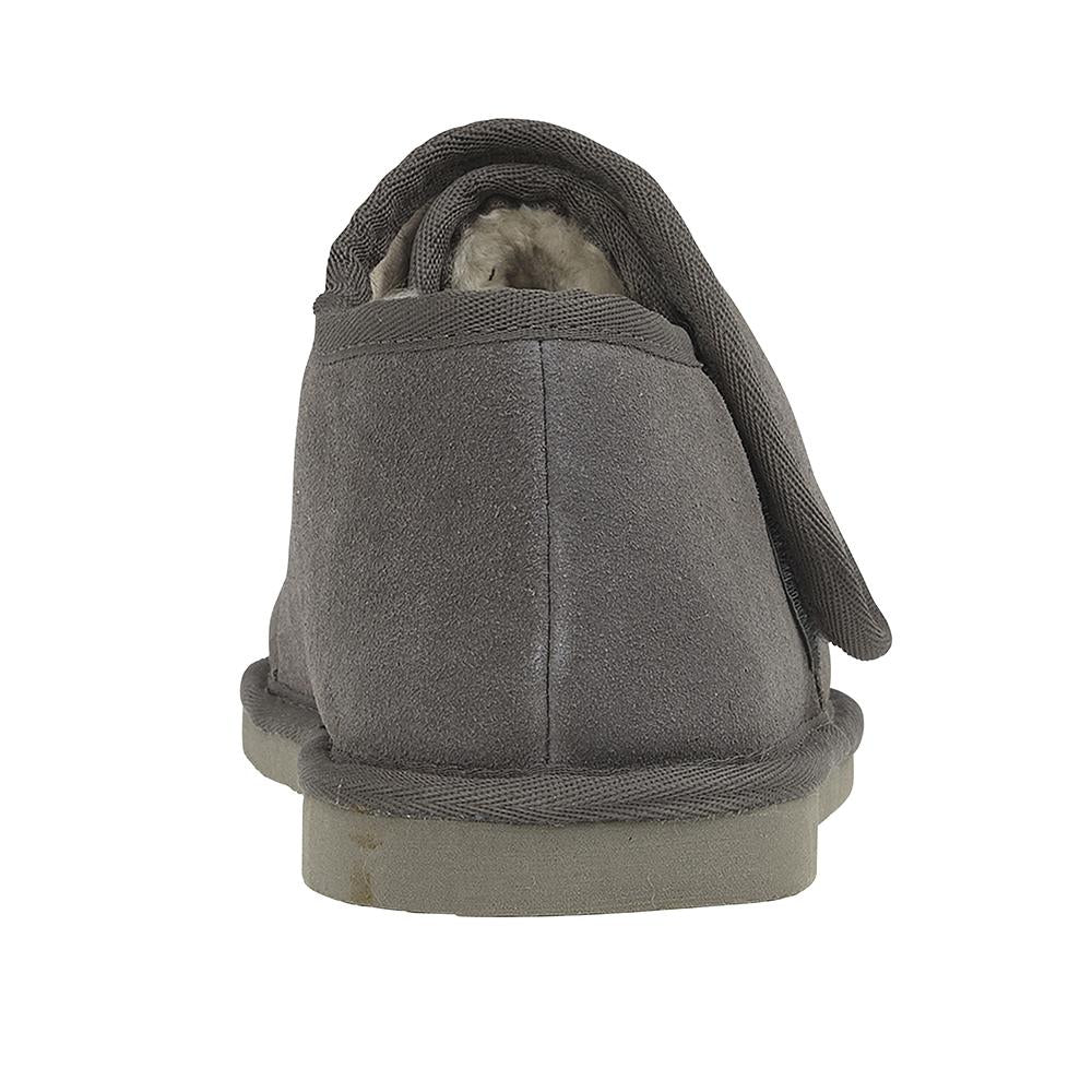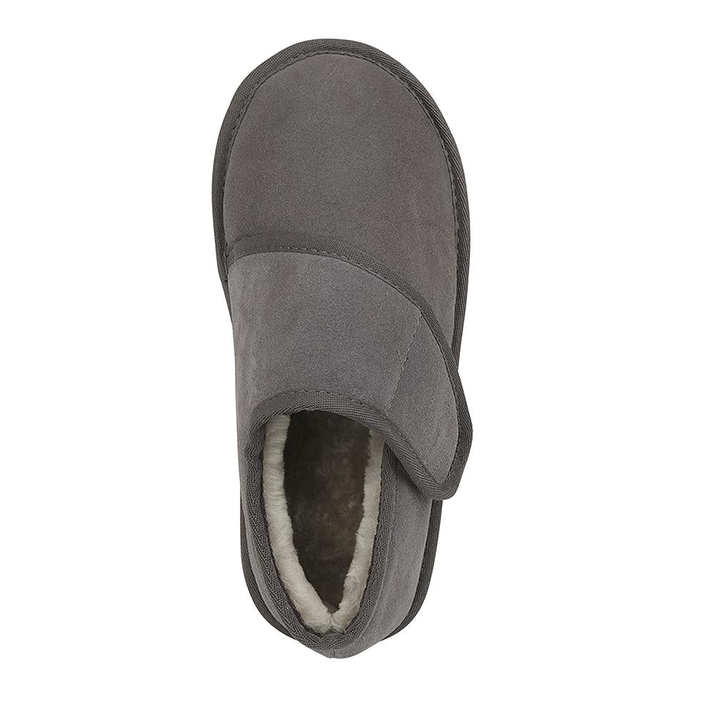 Bailey is our extra-wide fitting slipper shoe. It is 4E wide fitting. They have a suede upper, our signature British shearling lining and durable rubber sole which is lightweight. It has a removable insole and velcro fastening at the top. It is unisex for both men and women.