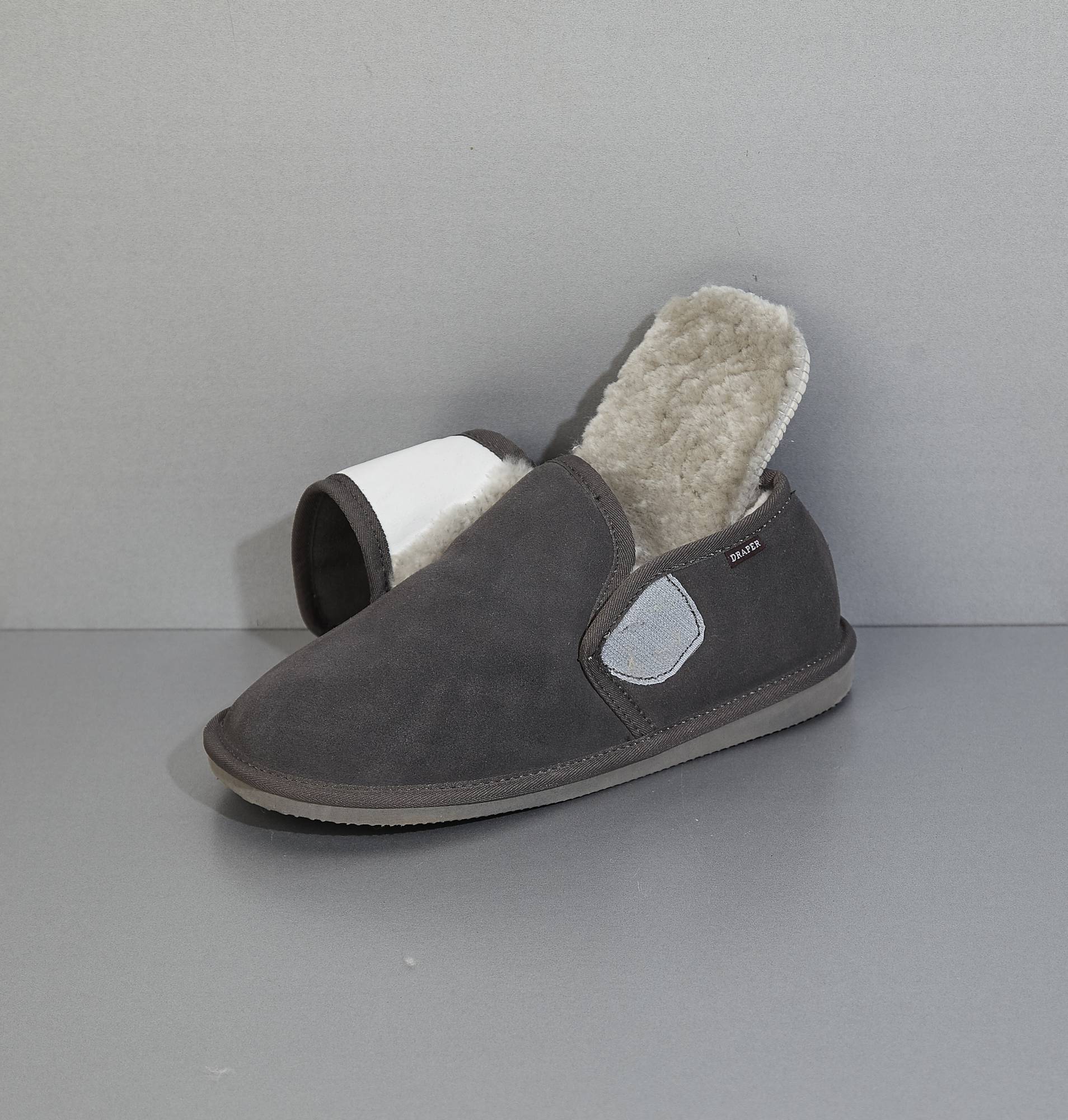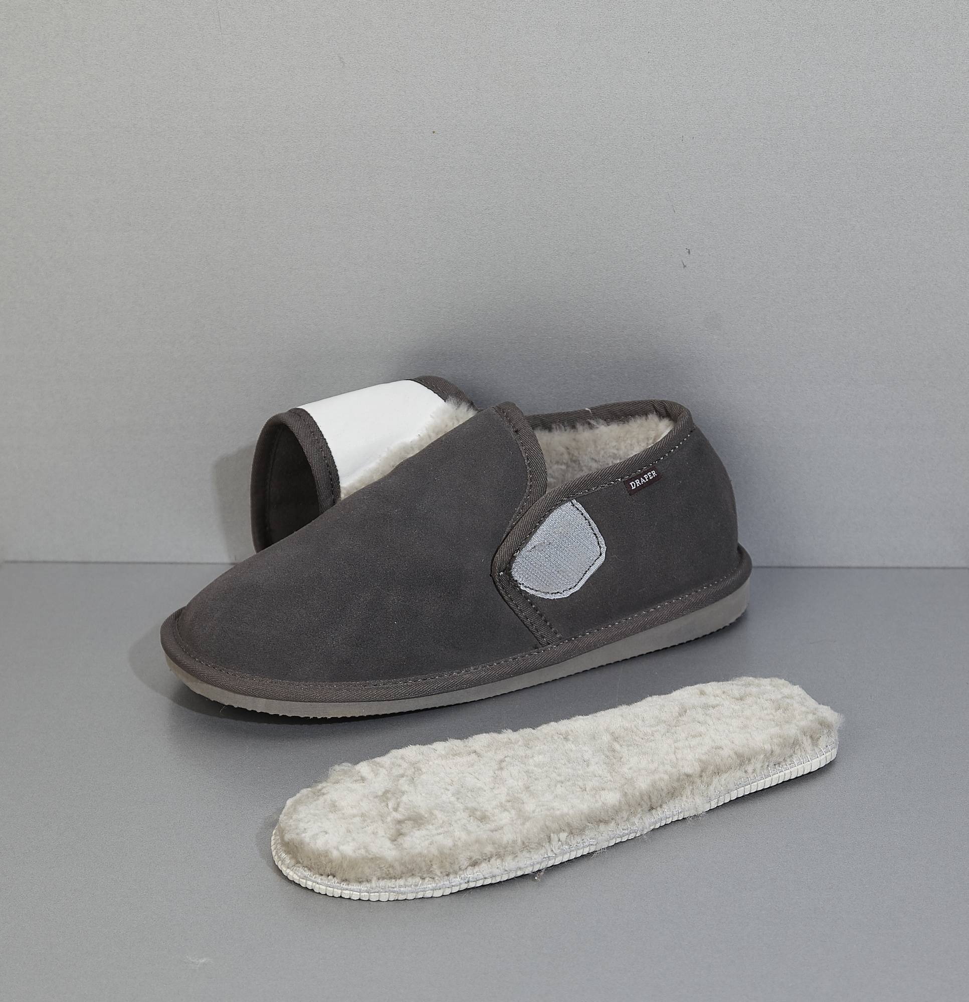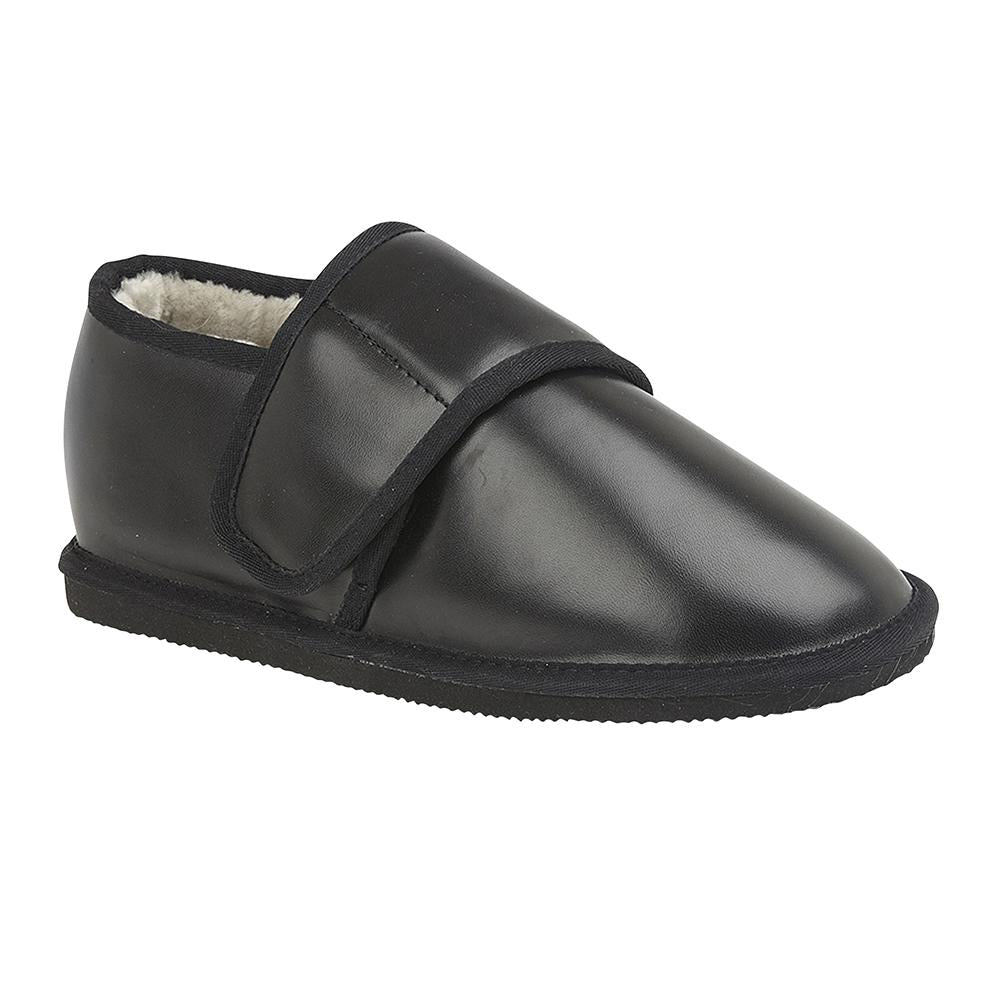 Bailey is our extra-wide fitting slipper shoe. It is 4E wide fitting. They have a suede upper, our signature British shearling lining and durable rubber sole which is lightweight. It has a removable insole and velcro fastening at the top. It is unisex for both men and women.