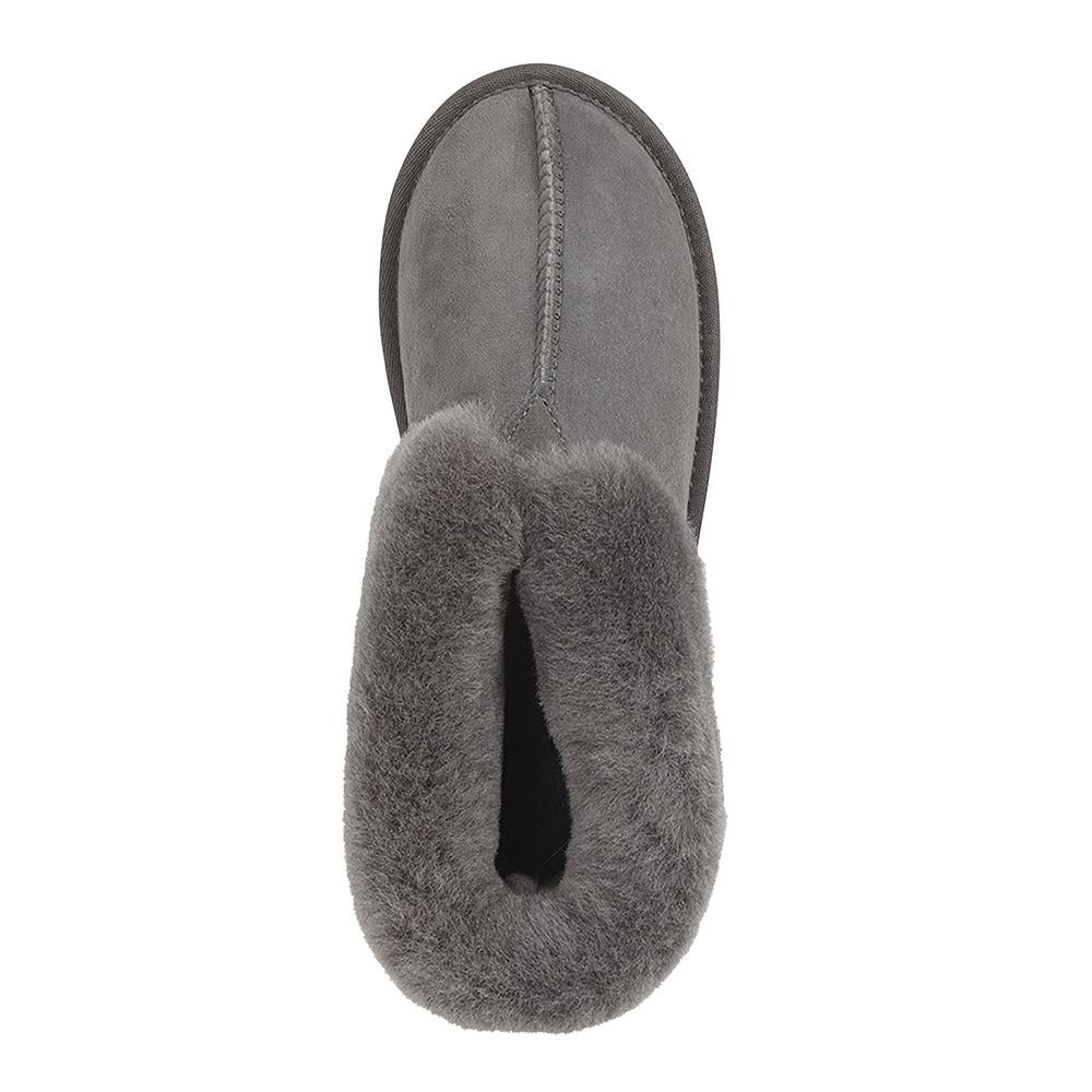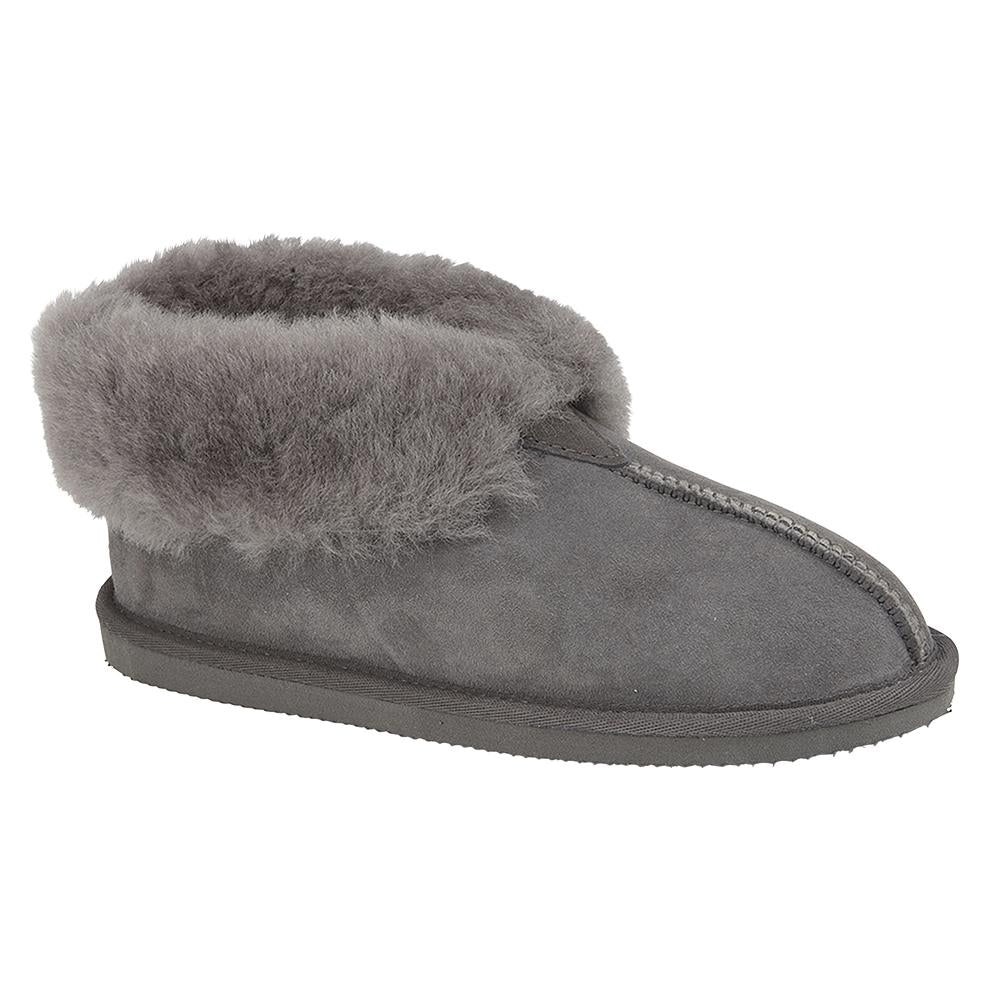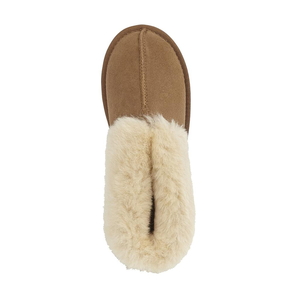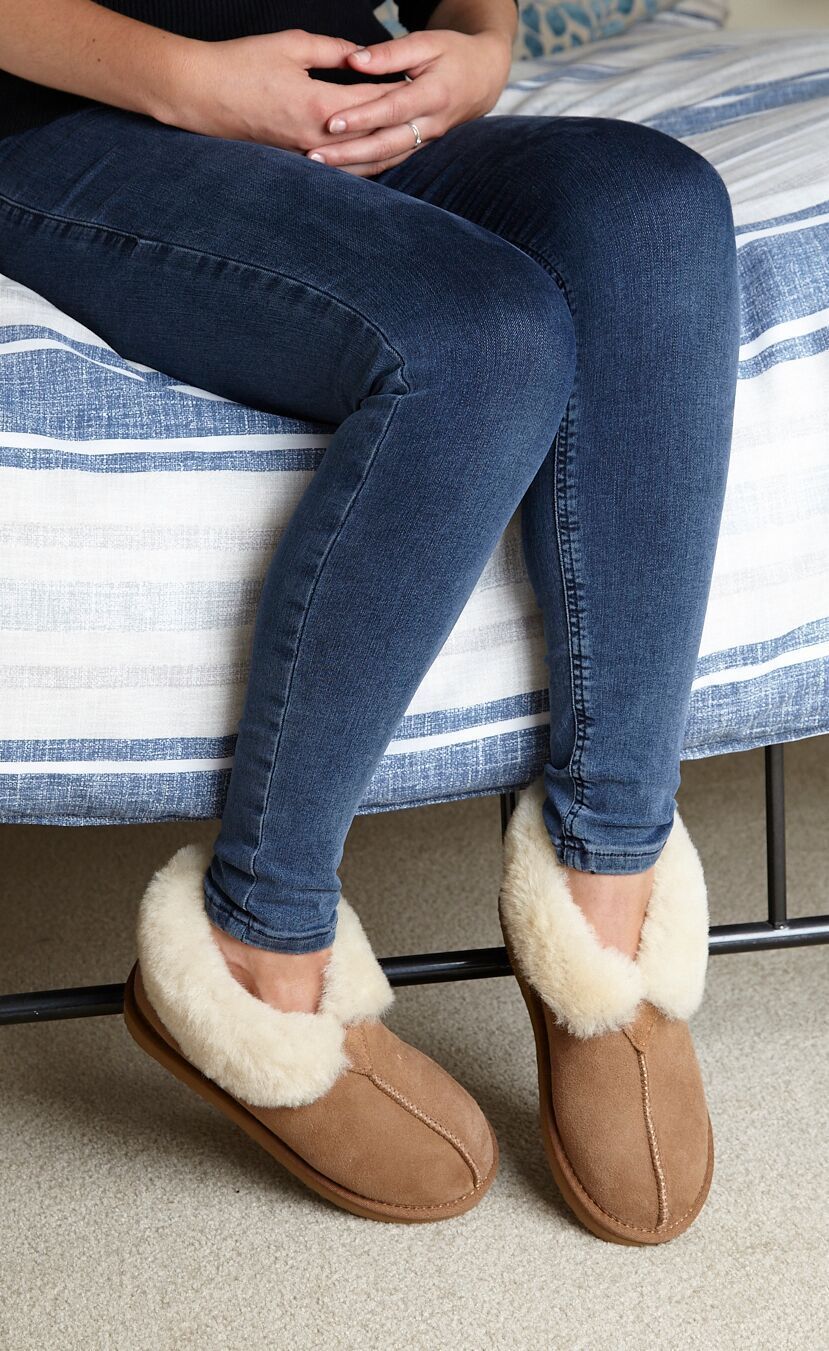 Our women's shearling slippers with a collar that folds up over the ankles for maximum warmth and comfort. Made with a suede upper, our signature British shearling lining and a durable rubber sole. A bootie style slipper for women.