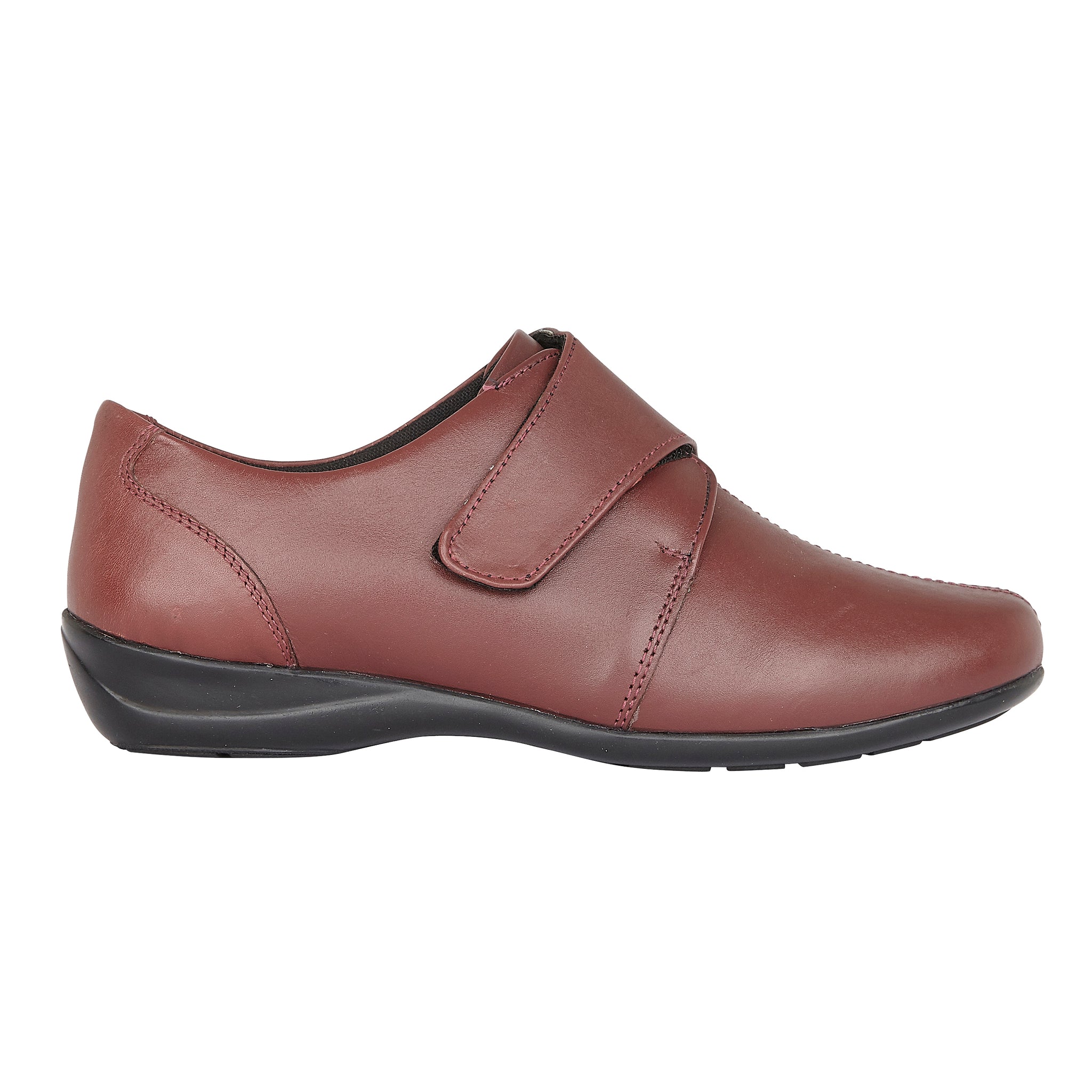 A ladies shoe which is very high quality. It is made with a waterproof leather upper, leather insole and hard wearing sole. Velcro fastening. E fitting (wide).
